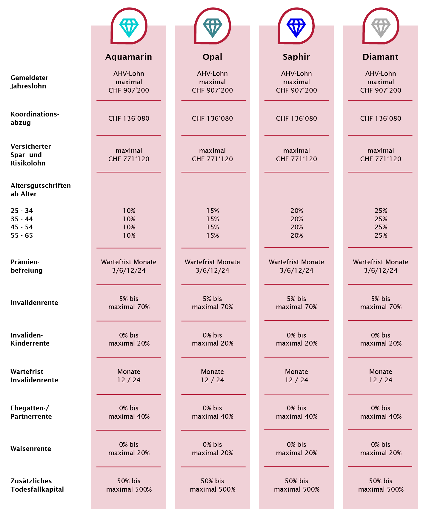 Mitglieder erhalten Zugang zu übersichtlichen Vorsorgelösungen zur Absicherung der Folgen Alter, Tod und Invalidität. Anspruch des Verbands ist es, zeitgemässe und fortschrittliche Vorsorgelösungen mit attraktiven Risikoprämien den Mitgliedern anzubieten.